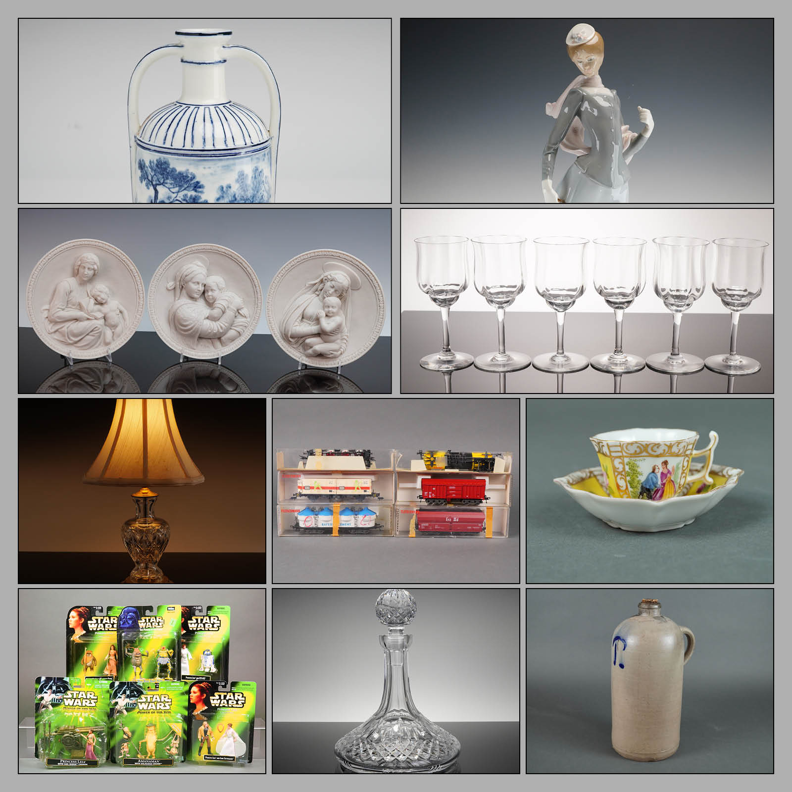 Exceptional Multi-Estate Collectibles presents 414 lots of porcelain, crystal, and figural collectibles drawn from multiple consignments. Lladro and Royal Doulton lead the sale with a large selection of porcelain figurines and character jugs, forming the core of the catalog with recognizable and widely collected names.